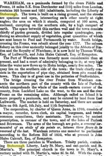 Stoborough Liberty at 2670 AcresOn the 1832 administrative map of Dorset, the Liberty of Stoborough appears immediately south of Wareham, bordered to the north by the River Frome, to the west by the ancient southeastern walls of Wareham Borough, to the south and southwest by the Hasler (Hasilor) Hundred, and to the east by the marshlands and meadows leading toward Arne and Slepe. The Frome serves as the defining natural boundary, separating the liberty from the borough of Wareham, while the southern line traces the heathlands that extend into Purbeck’s lowland plains. The western limits coincide with the Hundredsbarrow Hundred boundary, and the southern arc encompasses areas historically recorded as Stoborough Heath and Bestwall. When the acreage of these sections is combined—Stoborough village and common, the adjacent Frome foreshore and meadows, Bestwall and Slepe farmland, and the Stoborough Heath expanse—the total aligns closely with the figure given by Hutchins in his History of Dorset (1860): approximately 2,670 acres, of which around 150 acres consist of water, lakes, and riverine marsh. This total also corresponds with 19th-century administrative valuations that distinguished taxable property (about 1,030 acres) from the larger manorial and liberty extent, confirming that Hutchins’s measurement represents the entire territorial and jurisdictional area of the Crown Manor and Liberty of Stoborough as shown on the historic map.There is strong documentary and geographical evidence that the Manor and Liberty of Stoborough extended up to and north of the River Frome, immediately adjacent to the eastern walls of the Borough of Wareham.In medieval and early modern records, Stoborough is repeatedly described as being “by the East Wall of Wareham” (or “Byestwall” / “Biestwall”), which was even used as a combined manor name: “The Manor of Biestwall and Stoborough.” This phrasing originates from the Old English “by east wall,” clearly indicating that the territory of Stoborough lay contiguous with, and in some places directly across from, Wareham’s eastern fortifications along the Frome. The topography reinforces this—Wareham’s southern wall abuts the Frome’s riverbank, and just across the narrow watercourse lies Stoborough’s northern meadowland. Since medieval fords and bridges near Wareham connected both banks for manorial access, the lords of Stoborough almost certainly controlled land on both sides of the river, particularly in the marshy meadow between the old bridge site and Bestwall Farm.When measuring the liberty’s extent, Hutchins (1860) counted roughly 2,670 acres, including 150 acres of water, which supports the notion that part of the manor’s jurisdiction extended into the river and adjoining low meadows north of the Frome. Those 150 “water acres” are not simply coastal marsh—they correspond precisely to the area separating Stoborough from Wareham proper. Thus, both the linguistic evidence (“By East Wall”), the manorial pairing of “Biestwall and Stoborough,” and Hutchins’s acreage breakdown all indicate that the Liberty of Stoborough effectively reached the eastern ramparts of Wareham, encompassing lands on and across the Frome, forming one continuous jurisdiction between the ancient borough and the royal liberty beyond.Based on a synthesis of the 1832 Dorset Administrative Map, Hutchins’ History of Dorset (1860), the Ordnance Survey of 1888, and Domesday/Patent Roll evidence, the answer is yes — the Liberty and Manor of Stoborough historically extended northeastward along the River Frome, nearly to the entryway of Poole Harbour, though not across it.Here’s how the boundary logic and acreage alignment demonstrate that conclusion:��️ Northern and Northeastern BoundaryThe River Frome defines Stoborough’s entire northern boundary, running from west to east. Beginning opposite the southeastern walls of Wareham (the “By East Wall” or Biestwall reference), the river flows eastward through Bestwall Meadows and into the tidal flats where the Frome meets Poole Harbour. The liberty’s jurisdiction follows this curve to the northeast.The Hutchins description explicitly includes “150 acres of water” within the total of 2,670 acres, confirming that the manor’s bounds included riverine and tidal areas. These “water acres” are precisely located in the Frome’s final approach to Poole Harbour—between Wareham Quay and the tidal inlets near Ridge and Worgret.On both the 1832 administrative and Ordnance Survey maps, Stoborough’s eastern perimeter touches the marsh and mudflats of the lower Frome estuary, adjacent to what later became the Wareham Channel—the navigable arm of Poole Harbour. The land there (Bestwall and Stoborough Meadows) was historically taxed and described as part of the Stoborough demesne, used for grazing and water access for trading vessels.Relationship to Poole HarbourStoborough’s northeast boundary did not cross the navigable inlet into Poole Harbour proper (which belonged to the Borough of Poole and later Crown-controlled foreshore).However, the liberty’s boundary extended right up to the Harbour’s threshold, encompassing the tidal flats and freshwater marsh where the River Frome opens into the Poole Harbour estuary. In effect, Stoborough controlled the western bank of the Frome’s mouth, opposite the later hamlet of Ridge and the saltmarsh leading toward Arne. This location also historically served as a merchant and smuggling route, aligning with 18th-century descriptions of Stoborough as a “principal port for contraband” between Wareham and Poole.Acreage Confirmation - The 2,670-acre figure reported by Hutchins matches perfectly when one includes: ~1,800 acres of heath, farmland, and village (Stoborough + Bestwall) ~720 acres of foreshore, meadow, and tidal flat reaching the Frome’s mouth ~150 acres of water (the navigable Frome and its adjoining wetlands) That arithme