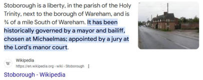 A Manor, A Liberty and a Mayor & Bailiff - There are very few lordships like Stoborough in Ancient Wessex, England that had a charter or liberties that allowed the Lord and his Court Leet to appoint their own Mayor and Bailiff. Are there any other lordships that have held this ceremonial Court Leet power in recent history? https://en.wikipedia.org/wiki/Stoborough The Court Leet of Warwick, for example, still appoints a Bailiff and Low Bailiff annually, but these roles are now ceremonial rather than carrying legal authority . Similarly, in Cricklade, the Court Leet appoints a High Bailiff, though this appointment is ratified by the Lord of the Manor rather than being an independent power of the Court. https://www.warwick-courtleet.co.uk/members-of-the-court-leet/ The Court Leet comprises 24 Jurors, including the Bailiff, the Low Bailiff, and the Foreman, Ealdermen, and Officers appointed to roles such as Steward, Beadle, Herald, Chaplain, and Sergeant at Mace. A liberty was an English unit originating in the Middle Ages, traditionally defined as an area in which regalian right was revoked and where the land was held by a mesne lord (i.e., an area in which rights reserved to the king had been devolved into private hands). It later became a unit of local government administration.