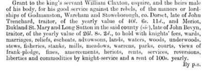 co. Dorset, late of John Trenchard, traitor, of the yearly value of 401.